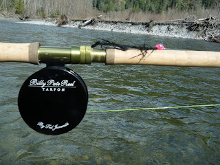 Ezen a részen még bokáig érő hó volt!Ennek ellenére épp sátort bontó táborozókkal találkoztunk.Szerelést cseréltünk.a kis botok helyett a nagy vadölőket vettük elő.Pisti a 9# bottal,én a speyel indultam a vízhez.A folyó nagyon alacsony vízállással fogadott minket és nagyon tiszta is volt.Nem könnyű.Pisti a kis ág kifolyóját próbálta hátha bull v. pisztráng akad a lefolyáson.Javasoltam neki a magasabb ,kavicsos partot is,ahol a tavalyi hal jött,én meg megpróbáltam átvergődni a túloldalra.A kis vízállás ezt lehetővé tette,bár majdnem sikerült elázni.Felmentem pár száz métert és elkezdtem a dobálást.Pink Intruder,fekete-kék Intruder ,de semmi.Egész elértem már a sóderes magas part elé,de nulla.Egy víz alatti tuskófogáson kívül semmi akció.Még egy árva kis pisztráng se tépte a legyet.Pisti közben lentebb ment,de még látótávon belül.A "magaspart" előtt lecseréltem a legyet egy kb. 20cm hosszú,fekte zonkerből készült E.S.Leech-re.Ennek egy szimpla fekete zonker farka,egy nagyobb ólom szeme és némi pink feje van.A nagy hossz miatt a horog levágva(mivel itt ugye csak 1db! horog használható) és fonottra bekötve hátra egy másik horog,ami a zonker bőrébe van beakasztva.Ezzel a halál egyszerű léggyel kezdtem a szemközti partot célozgatni.Alig pár dobás után,sikerült egy szép hosszút is dobni,ami a túlpart elé csobbant.Épp két víz felé érő fa elé.Alig pár méter után,határozottan megállt a légy.KAPÁÁÁÁÁÁSSSSS!!!
